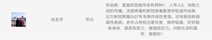 另外,媒體機(jī)構(gòu),企事業(yè)單位參與講座直播的熱情也很高,中央國家機(jī)關(guān)老年大學(xué)聯(lián)合教學(xué)組、國家開放大學(xué)老年大學(xué)、湖北之聲廣播電臺(tái)、北京人民廣播電臺(tái)、聽聽FM客戶端、云南老年報(bào)等均開辟了戰(zhàn)“疫”特別節(jié)目的第二課堂,通過同步網(wǎng)絡(luò)直播、音視頻傳播、開辟戰(zhàn)“疫”特別節(jié)目專欄等方式,共同推動(dòng)戰(zhàn)“疫”特別節(jié)目專家講座在老年人群中的傳播。